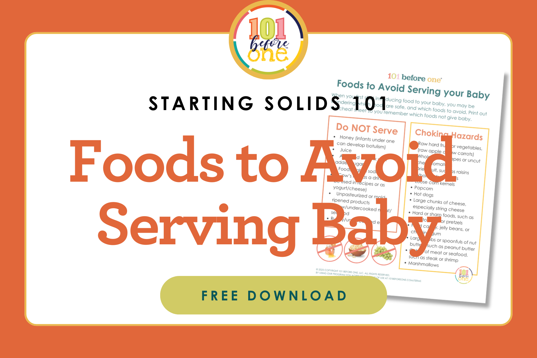 Inside this FREE DOWNLOAD you’ll get a full printable list of foods to avoid serving your baby + high-risk choking hazards to keep baby safe.