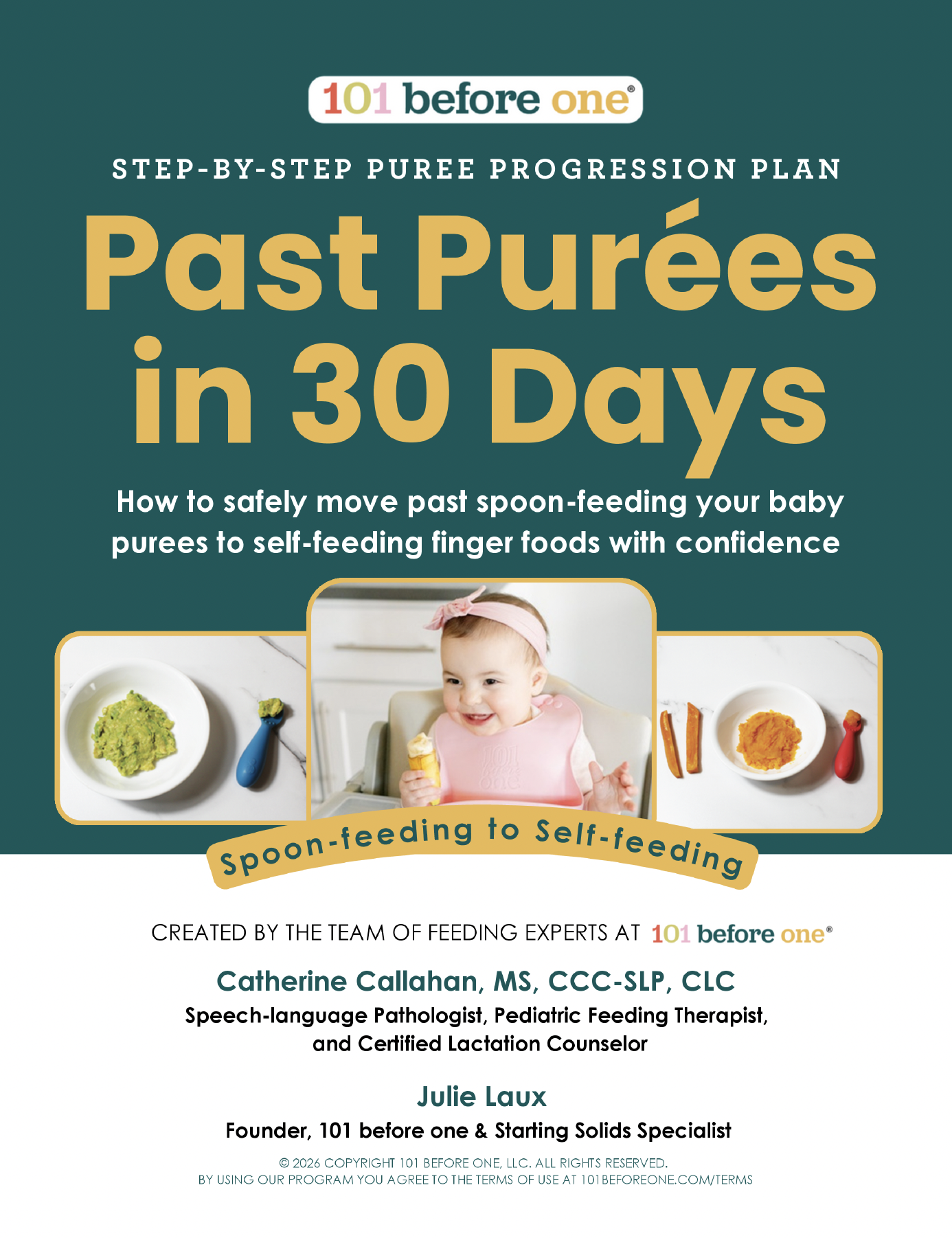 The 101 before one PAST PUREES IN 30 DAYS gives you a clear path to help your baby learn to self feed and chew safely, without rushing straight to finger foods. We will walk through 6 simple steps to slowly move from spoon-feeding purees to self-feeding finger foods.